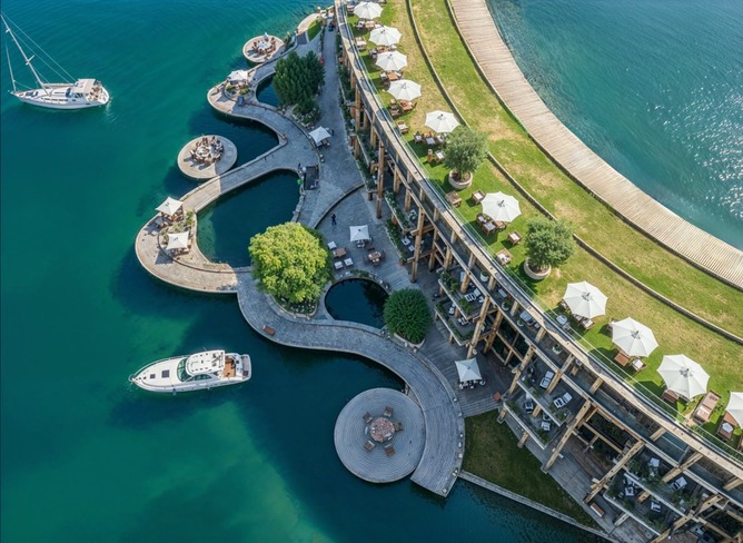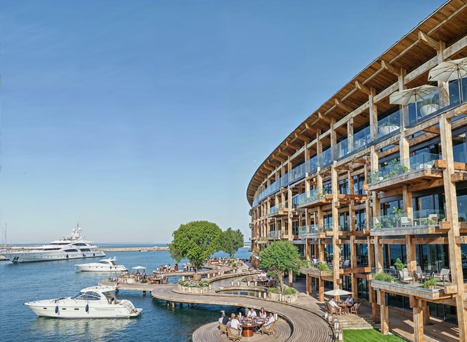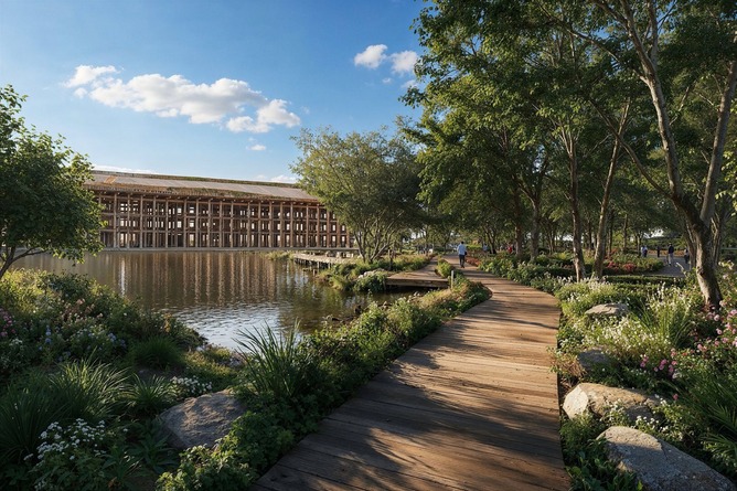 静けさの森をリング一杯に広げ公園化、海側は世界につながるマリーナに。課題のリングは一部をホテル化する事で構造を強化、屋上の遊歩道はこれまで通り。