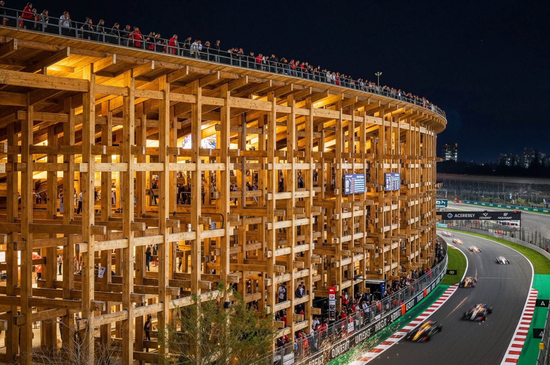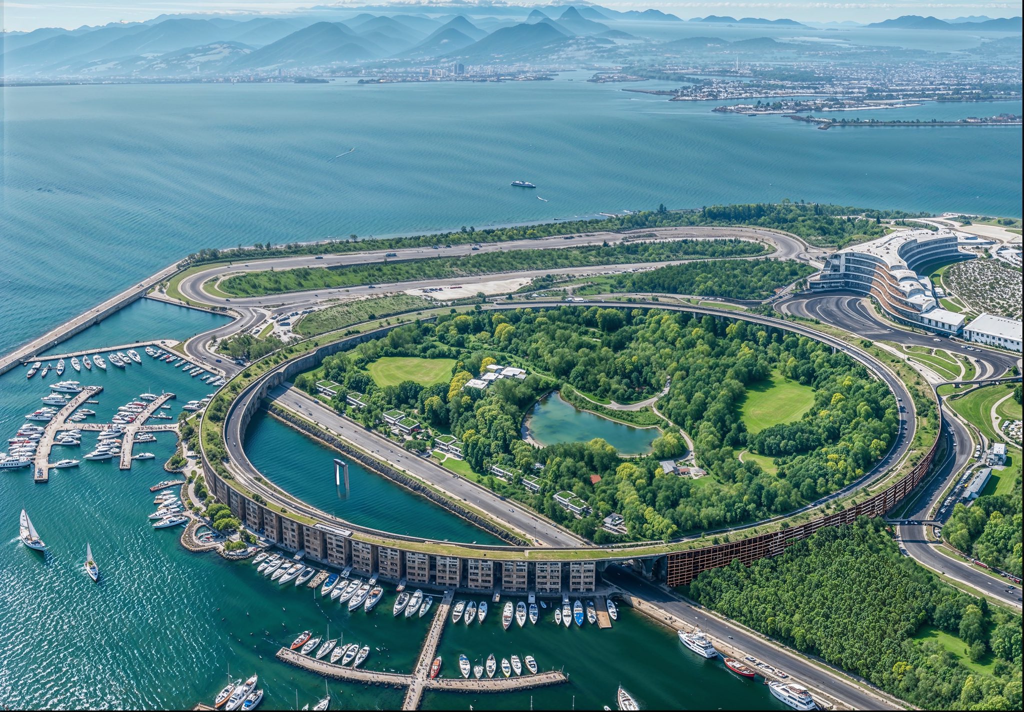 静けさの森をリング一杯に広げ公園化、海側は世界につながるマリーナに。課題のリングは一部をホテル化する事で構造を強化、屋上の遊歩道はこれまで通り。